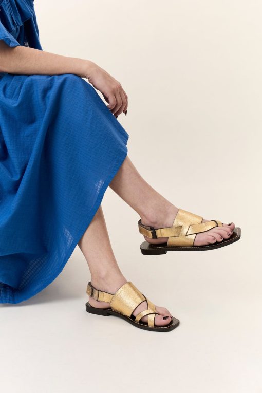 Apportez une touche d’éclat à vos looks estivaux avec les sandales Perri Plain. Confectionnées en cuir doré, elles se distinguent par leurs brides entrecroisées et leurs semelles plates ultra-confortables. Leur design élégant et minimaliste s’adapte aussi bien aux tenues décontractées qu’aux silhouettes plus habillées. Un essentiel chic et intemporel pour briller en toute occasion !