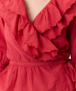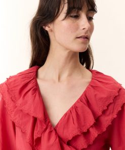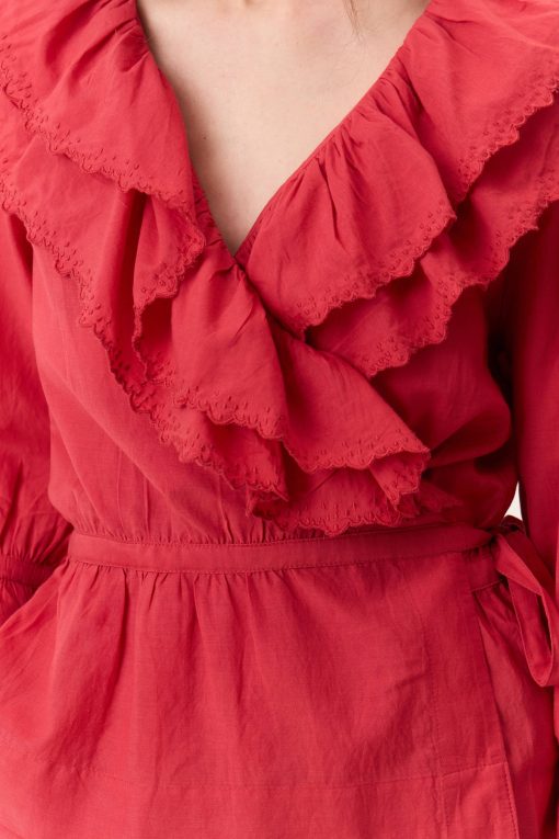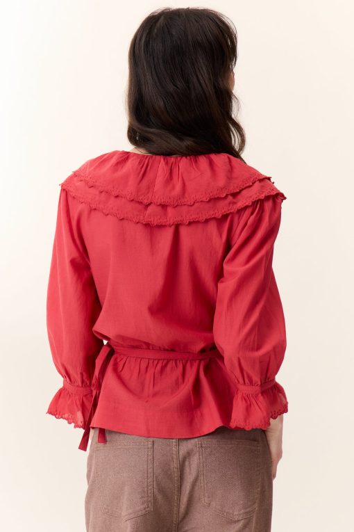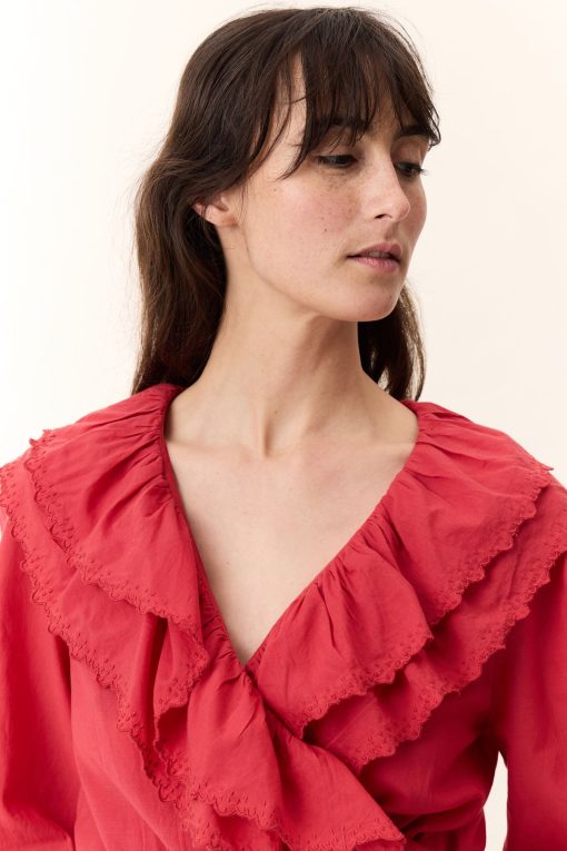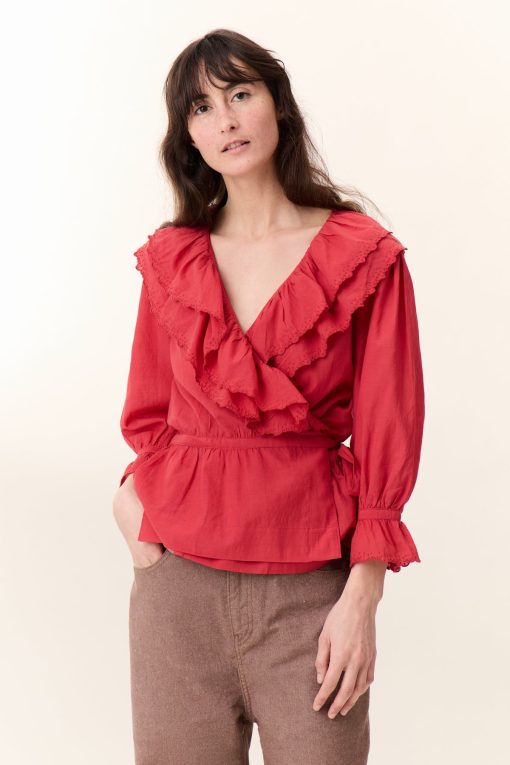 La blouse cache-coeur Cala Plain séduit par son charme romantique et ses détails délicats. Avec ses volants élégants et brodés qui habillent le décolleté, son tissu léger et sa ceinture, elle souligne la silhouette de la femme Leon & Harper et incarne la féminité !
