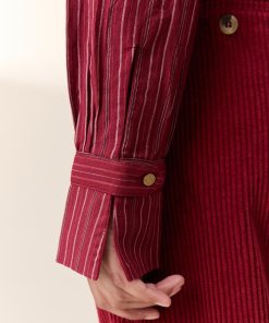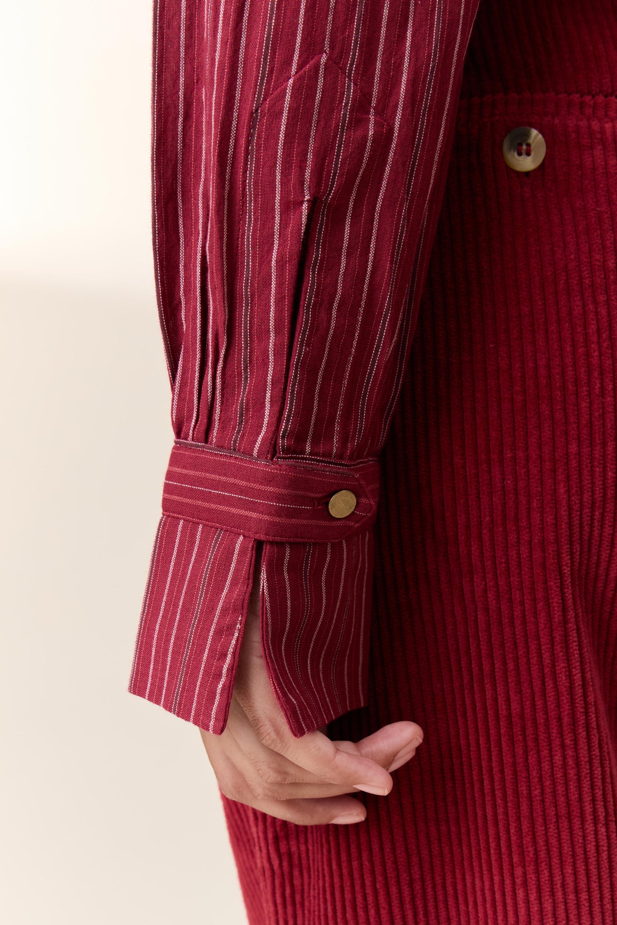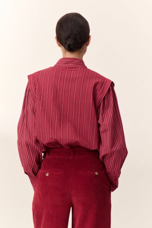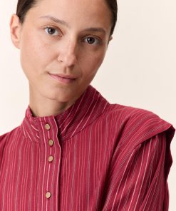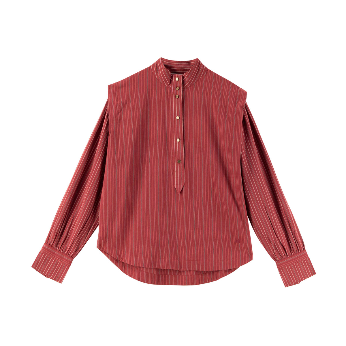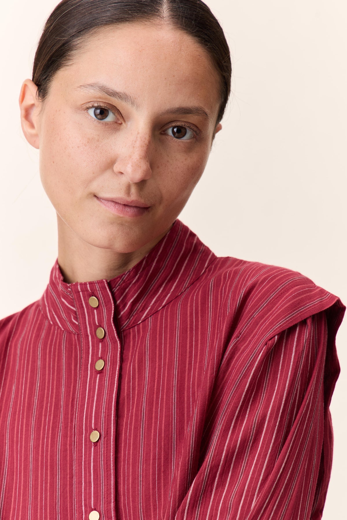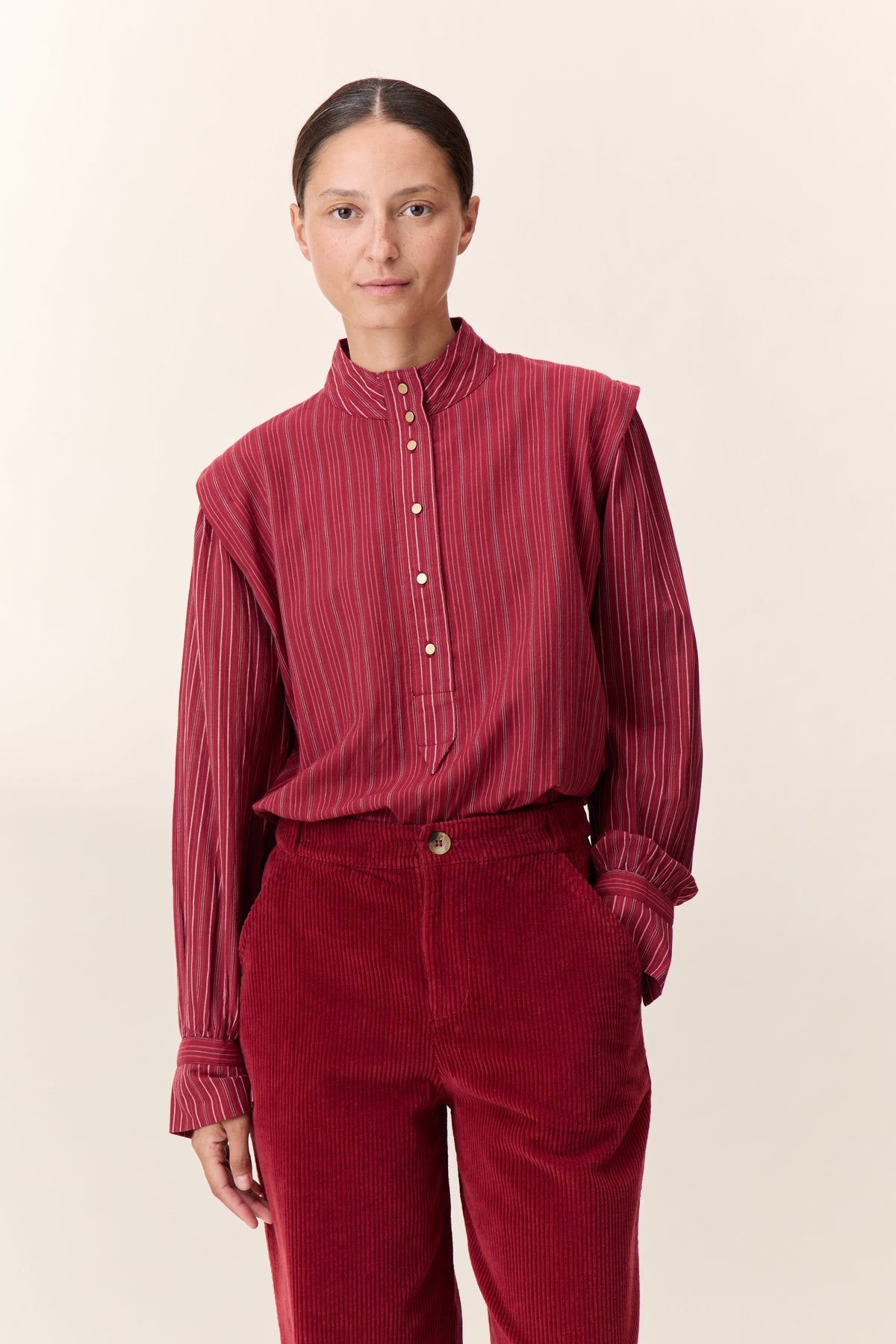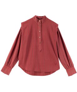 La blouse Cristo Strp mise sur un jeu de rayures verticales et un col montant travaillé. Sa patte de boutonnage discrète ponctuée de petits boutons souligne l’esprit Leon & Harper : précision dans le détail. L’empiècement aux épaules définit la silhouette tandis que les poignets fendus boutonnés apportent une note structurée. En 100% coton biologique, le tombé fluide répond à la recherche d’aisance chère à la marque. À porter avec un pantalon ajusté ou un jean pour un style urbain, modulable au fil des envies.