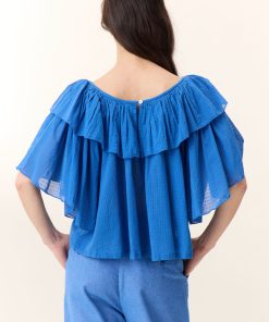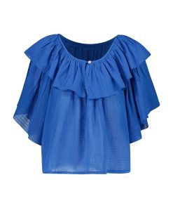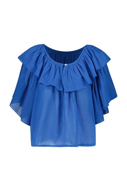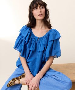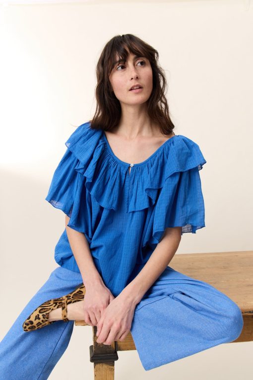 La blouse Casey Plain ajoute une touche de fraîcheur. Cette pièce élégante séduit par sa légèreté et ses détails travaillés. Son col rond évasé est sublimé par un large volant qui encadre délicatement les épaules, apportant un charme romantique à la femme Leon & Harper.