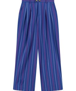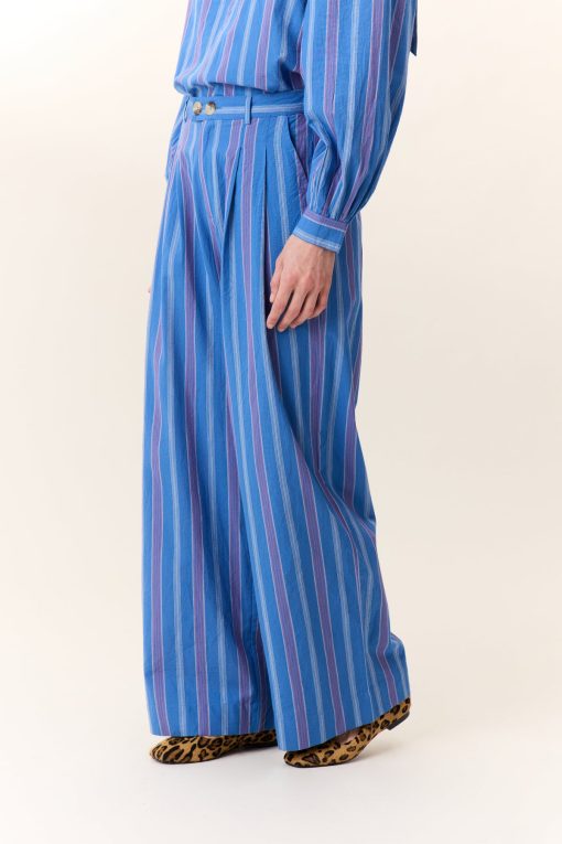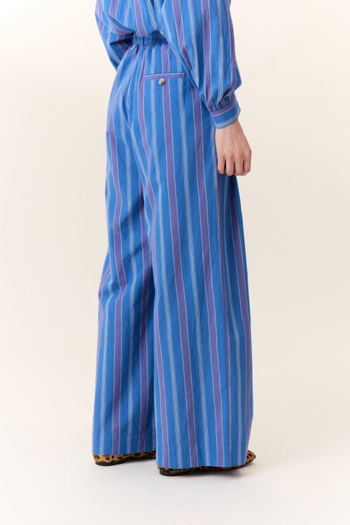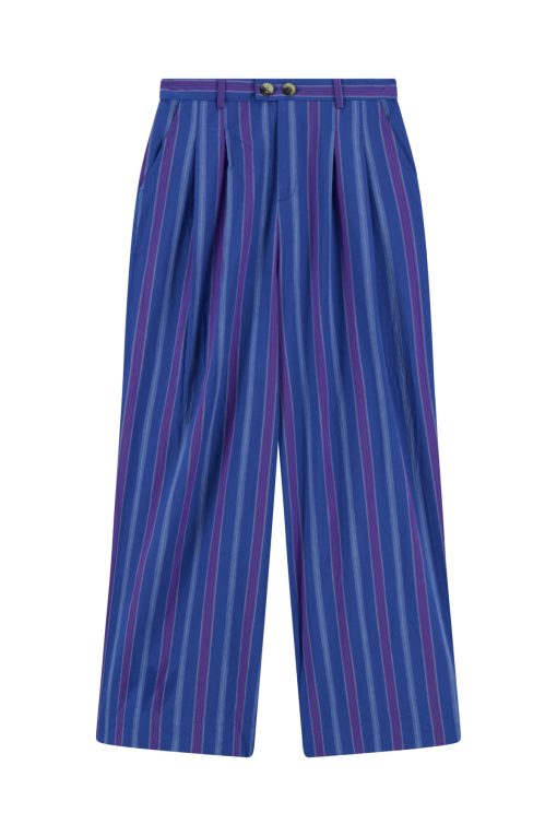 Affirmez votre style avec le pantalon Pamy Strp. Sa coupe droite et fluide, associée à des rayures audacieuses dans des tons de bleu et de violet, lui confère une allure à la fois chic et décontractée. Doté de plis marqués et d’une taille haute à double bouton, il allonge la silhouette avec élégance. Un incontournable pour une tenue moderne et sophistiquée