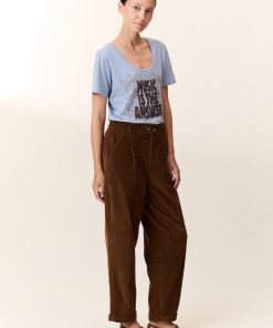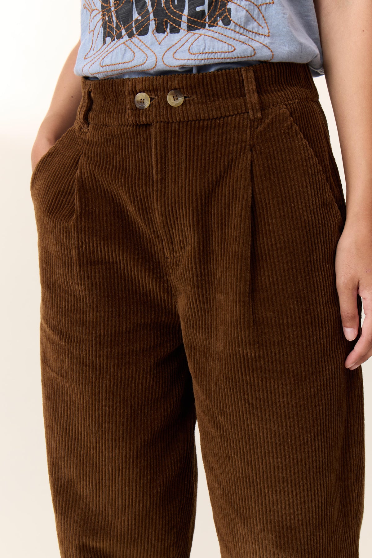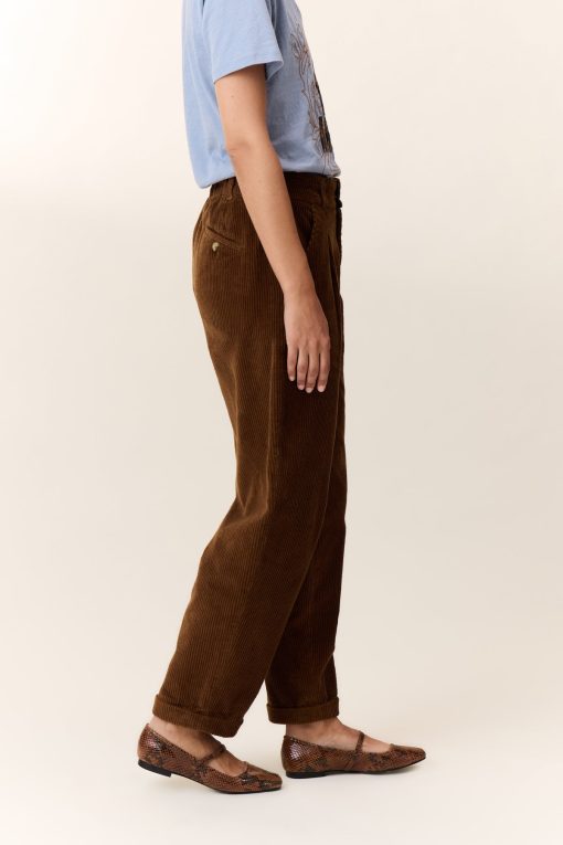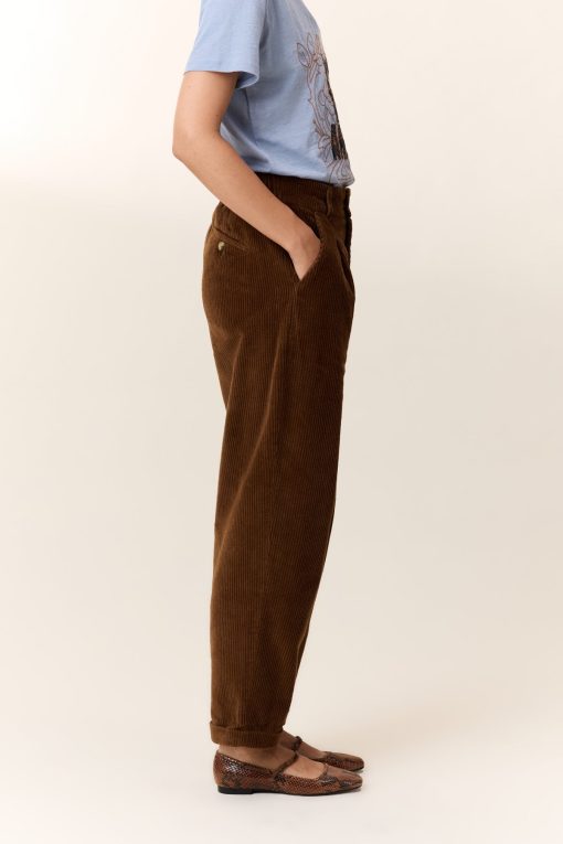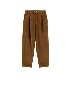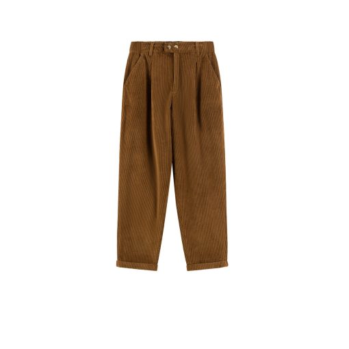 Le pantalon Prom PL marie une coupe ample à une taille haute pour donner du caractère à la silhouette tout en préservant la liberté de mouvement. Le velours côtelé, texture iconique de la saison, est travaillé ici avec des pinces marquées à l’avant qui sculptent le volume et valorisent le tombé. La ceinture, soulignée de passants et fermée par un bouton, dissimule un élastique discret au dos pour un confort ajusté. Les poches latérales et les poches passepoilées audos conjuguent fonction et style. Le revers cousu au bas du pantalon souligne une allure contemporaine. À associer à une chemise ample ou un pull texturé pour un style affirmé au quotidien.
