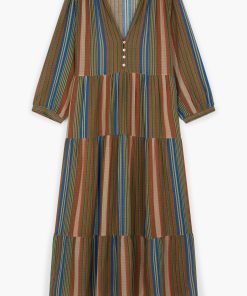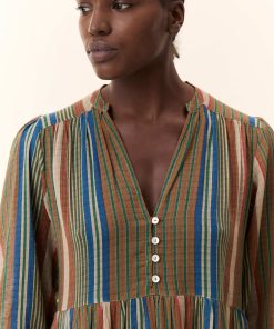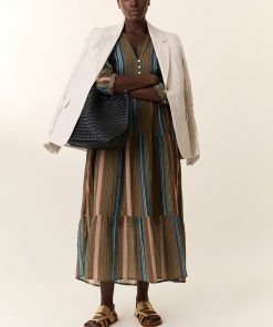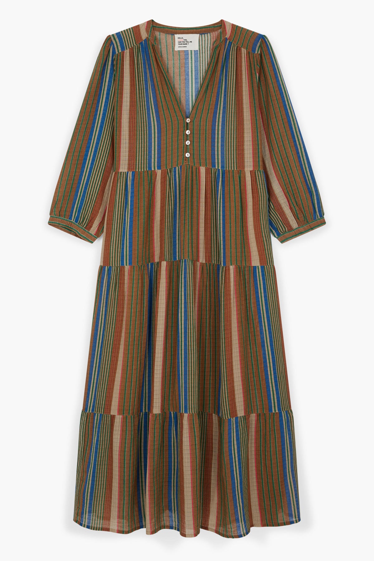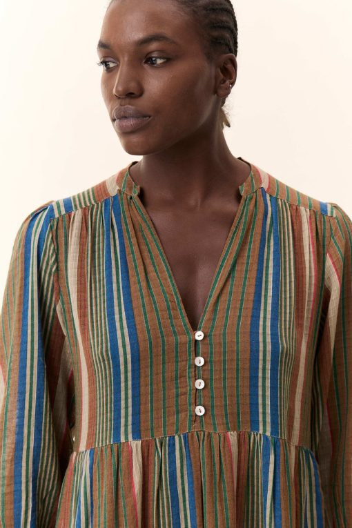 Véritable must-have, la robe Roezla Strp insuffle une allure bohème au vestiaire estival de la femme Leon & Harper. Sa coupe aérienne, réhaussée par un imprimé à rayures colorées, lui confère un confort absolue et une allure aérienne et féminine.