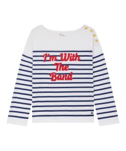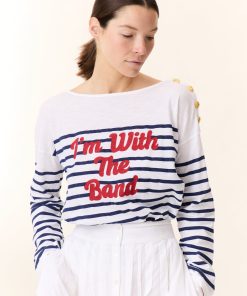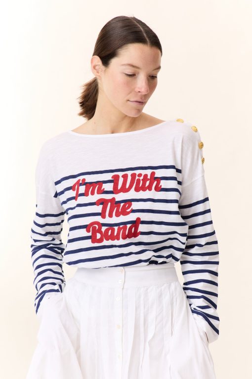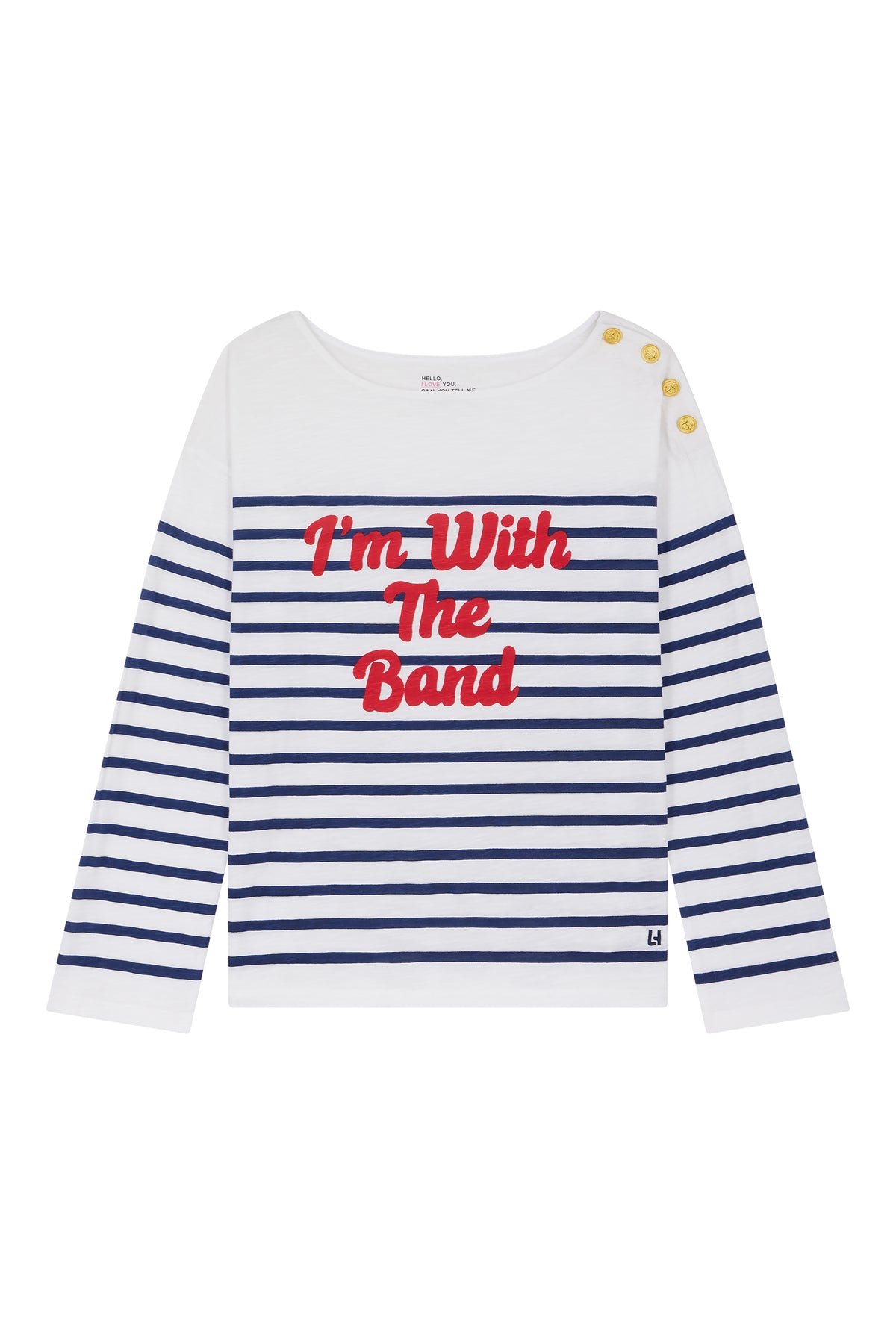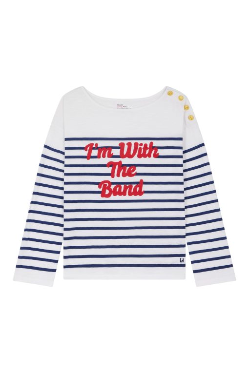 Le t-shirt manches longues Thilla Band revisite les codes de la traditionnelle marinière. Avec son message ‘I’m with the band’, il ajoute une touche de fantaisie au dressing estival de la femme Leon & Harper.
