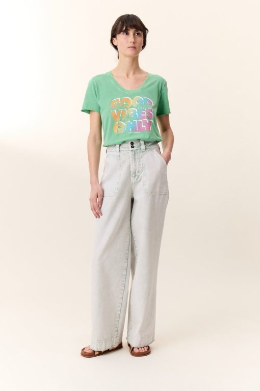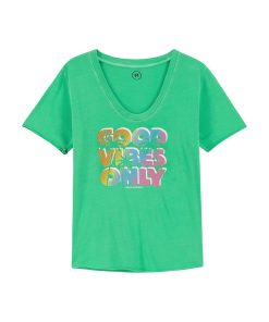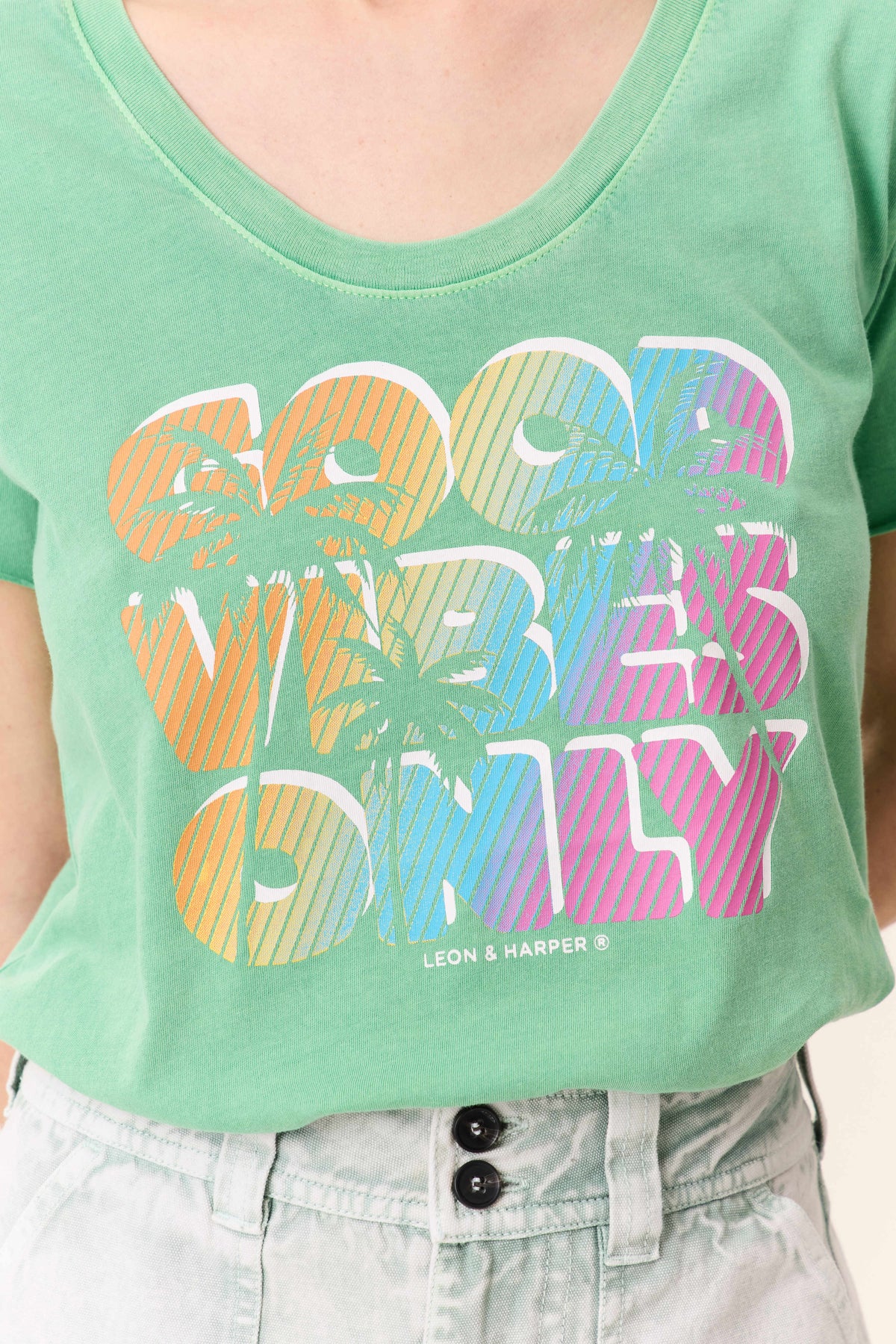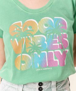 Le t-shirt Tizia Only offre un style décontracté et vintage avec son imprimé coloré « »Good Vibes Only » » et ses palmiers. La femme Leon & Harper l’associe à un jean ou un short pour une allure cool et effortless.